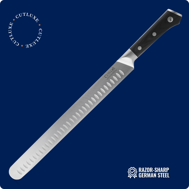 Cutluxe’s carving-ready butcher knives feature long, narrow blades designed for smooth, uninterrupted slices. From smoked brisket to roasted turkey, these knives glide through meat without tearing or shredding. The result? Beautiful, clean cuts that bring out the flavor and texture of every dish. With the right carving knife in hand, every slice becomes an expression of control and finesse.