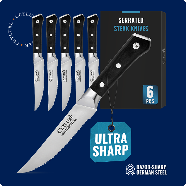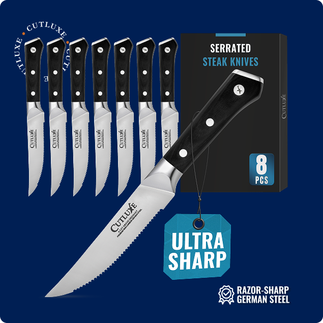 A good steak knife is more than just functional, it brings luxury to the table. Cutluxe steak knives are precision-forged from stainless German steel, known for its durability and ability to hold a sharp edge. Each of the knives is honed to perfection, ensuring it can handle thick cuts of steak meat as easily as thinner slices.