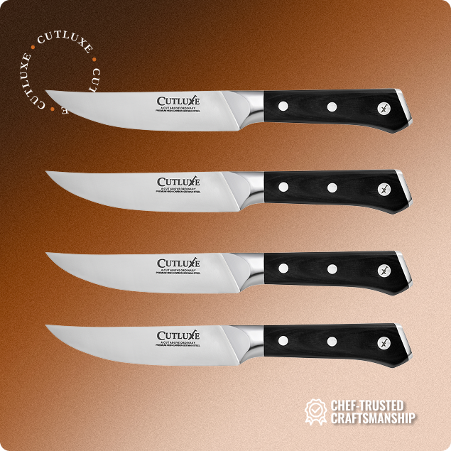 4 piece steak knife set with triple-riveted luxurious pakkawood handle, imported high carbon German steel, full tang construction and 5-Inch razor-sharp straight blade edge for effortless and precise slicing.