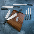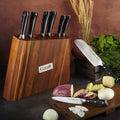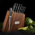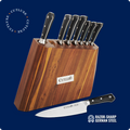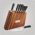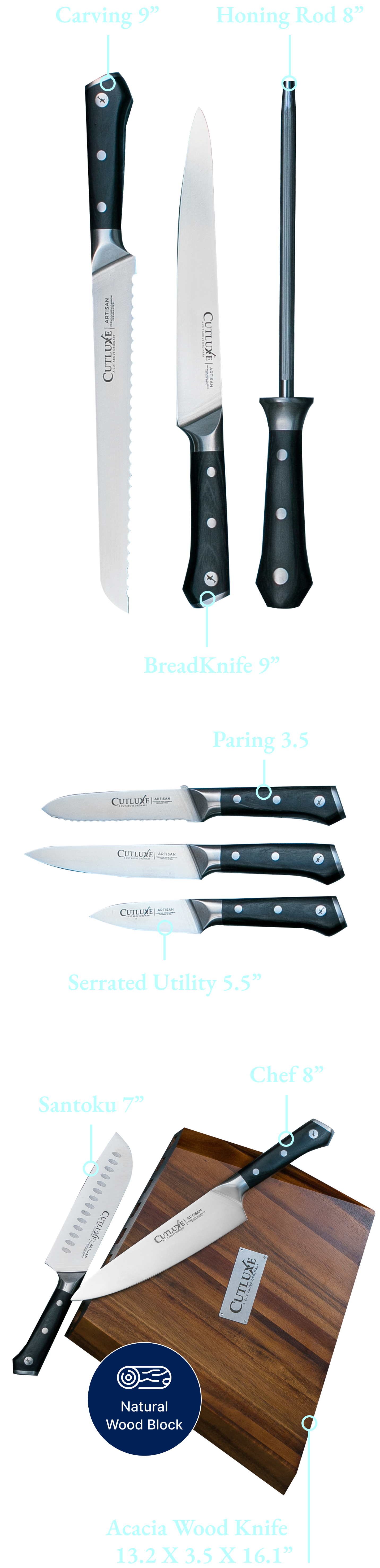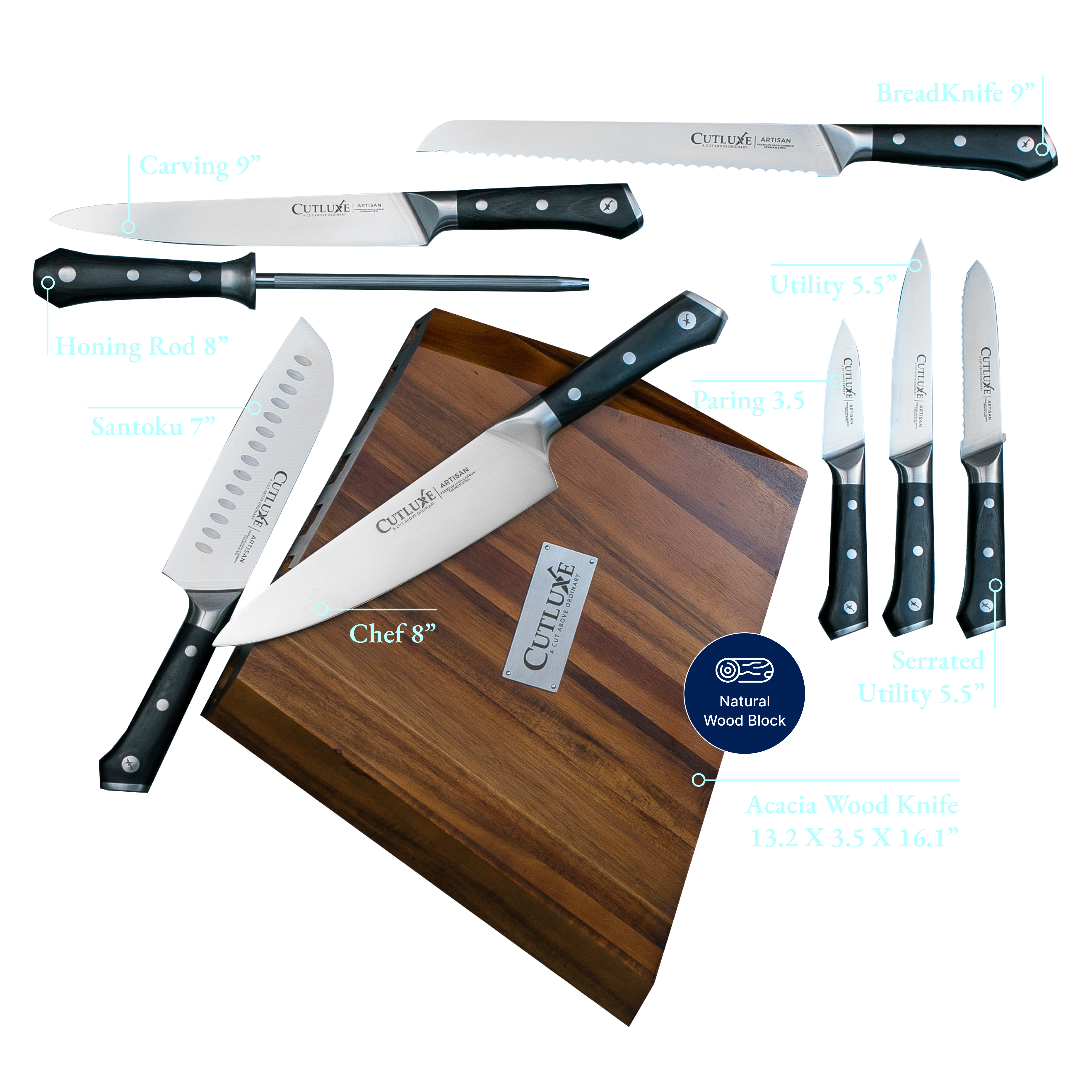 Includes: 10” Bread Knife, 9” Carving Knife, 8” Chef Knife, 7” Santoku Knife, 5” Serrated Utility Knife, 5” Utility Knife, 3.5” Paring Knife, 8” Honing Rod, and Acacia Wood Block.