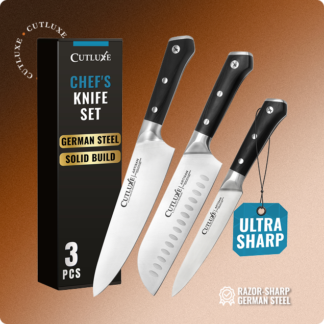 Master every meal with the Cutluxe 3-Piece Chef Knife Set. This set includes an 8” Chef Knife for slicing and chopping, a 7” Santoku Knife for precise cuts, and a 5.5” Utility Knife for smaller tasks – the perfect trio for any kitchen. Crafted from high-carbon German stainless steel, these knives offer razor-sharp edges and long-lasting durability. The full-tang construction and ergonomic pakkawood handles provide superior balance and comfort, giving you total control with every cut. Professional quality at a price that makes sense.