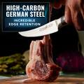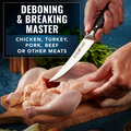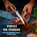 Built for those who know their way around a cut of meat, this premium boning and fillet knife delivers effortless precision for trimming, de-boning, skinning, and slicing. The curved, hand-sharpened German steel blade glides cleanly through meat and fish, while the full-tang pakkawood handle offers stability, comfort, and control in every motion. Rust-resistant, razor-sharp, and crafted to last, it’s a no-gimmick tool made for real work.