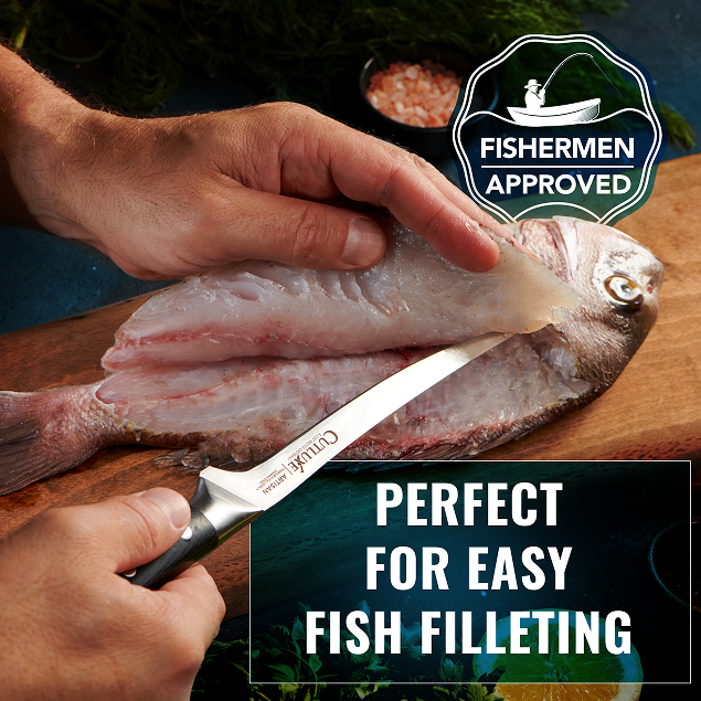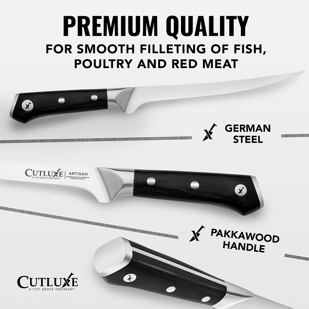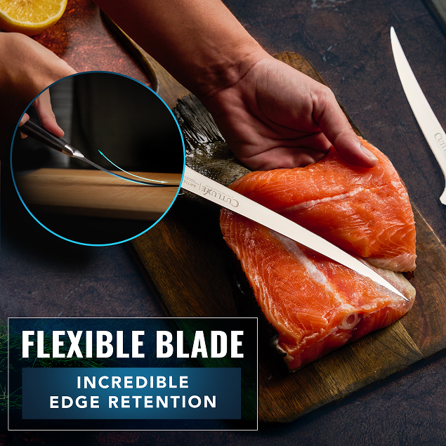 The Cutluxe Fillet Knife Set delivers professional-level precision for anyone serious about fish and meat prep. This two-piece set features both 7” and 8” flexible blades — each forged from high-carbon German steel and hand-sharpened for effortless filleting, trimming, and skinning. Whether you’re breaking down a whole salmon or fine-tuning delicate cuts, these blades offer the control and flexibility to get it right. Full-tang construction and ergonomic pakkawood handles give you a secure grip, even when things get slick. Built to perform. Backed for life.